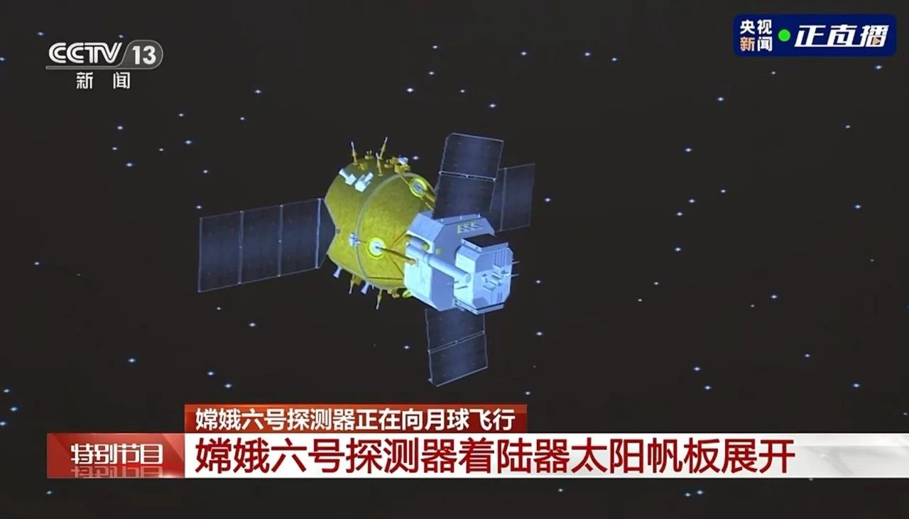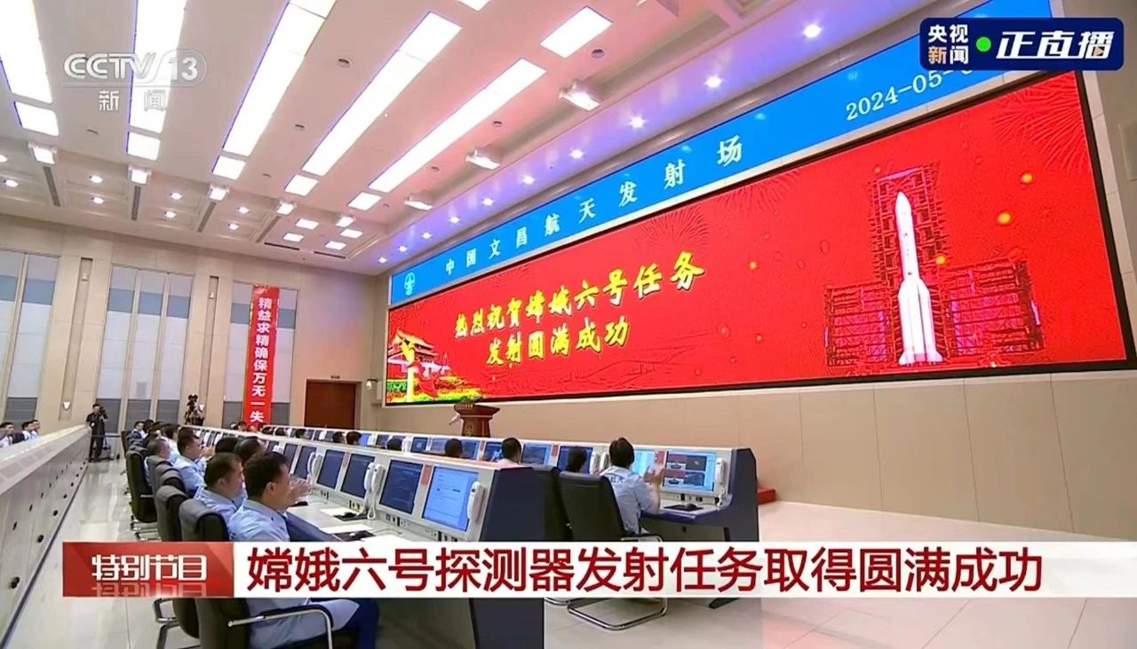 531727分,嫦娥六號探測器由長征五號遙八運載火箭在中國文昌航天發射場發射,之后準確進入地月轉移軌道,發射任務取得圓滿成功。嫦娥六號探測器由此開啟世界首次月球背面采樣返回之旅,預選著陸和采樣區為月球背面南極-艾特肯盆地。