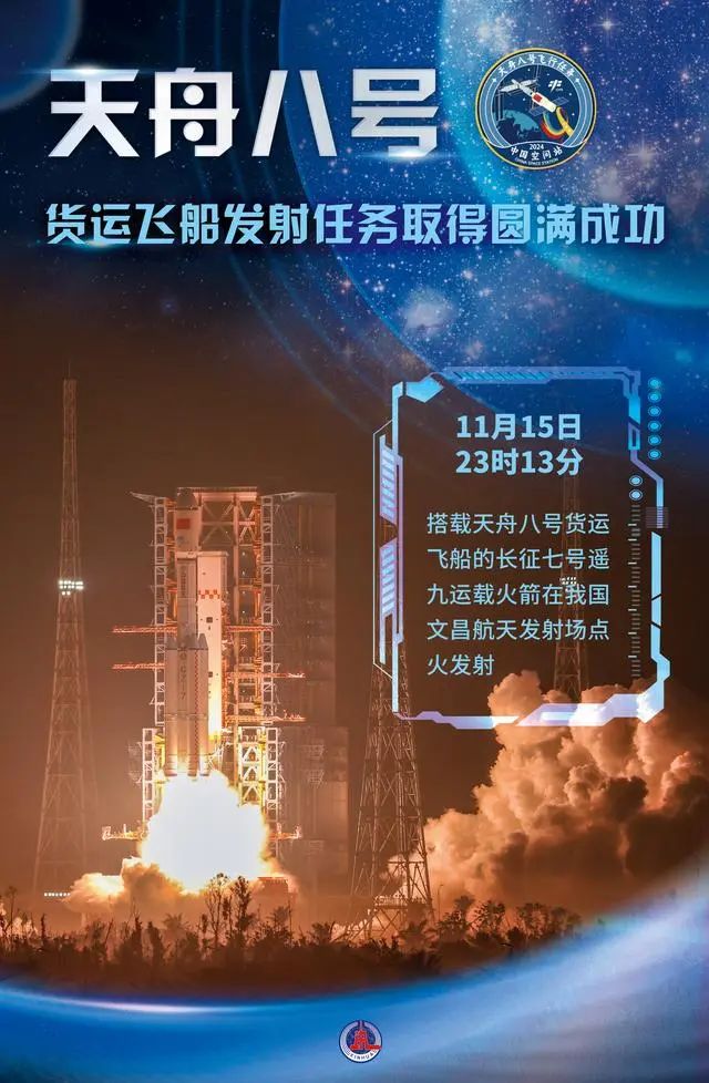 搭載天舟八號(hào)貨運(yùn)飛船的長(zhǎng)征七號(hào)遙九運(yùn)載火箭,于北京時(shí)間111523時(shí)13分在我國(guó)文昌航天發(fā)射場(chǎng)點(diǎn)火發(fā)射。