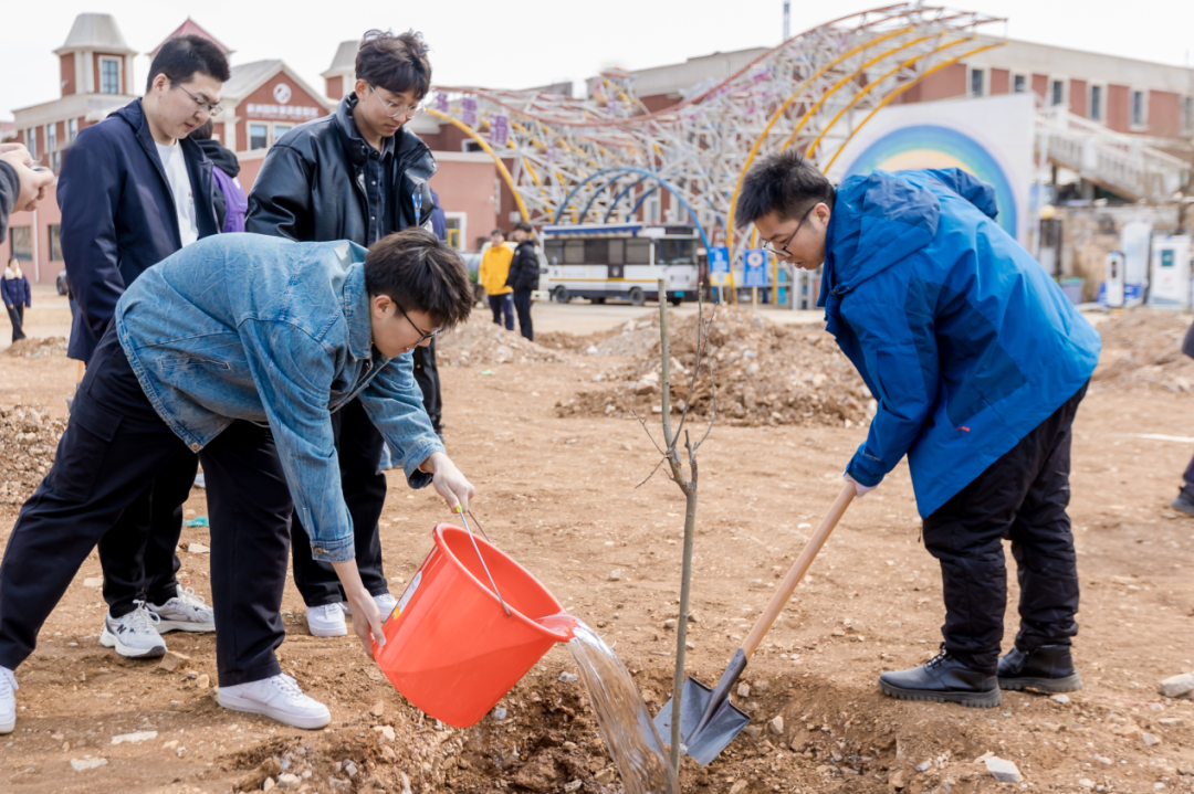 植樹現(xiàn)場(chǎng),春和景明,一片繁忙有序的勞動(dòng)景象。大家分工協(xié)作,默契配合,揮鍬鏟土、培土圍堰、提桶澆水,種下海棠、山楂、牡丹等樹苗。在和煦的春風(fēng)中,一株株樹苗錯(cuò)落有致地挺立著,展現(xiàn)出勃勃生機(jī)。