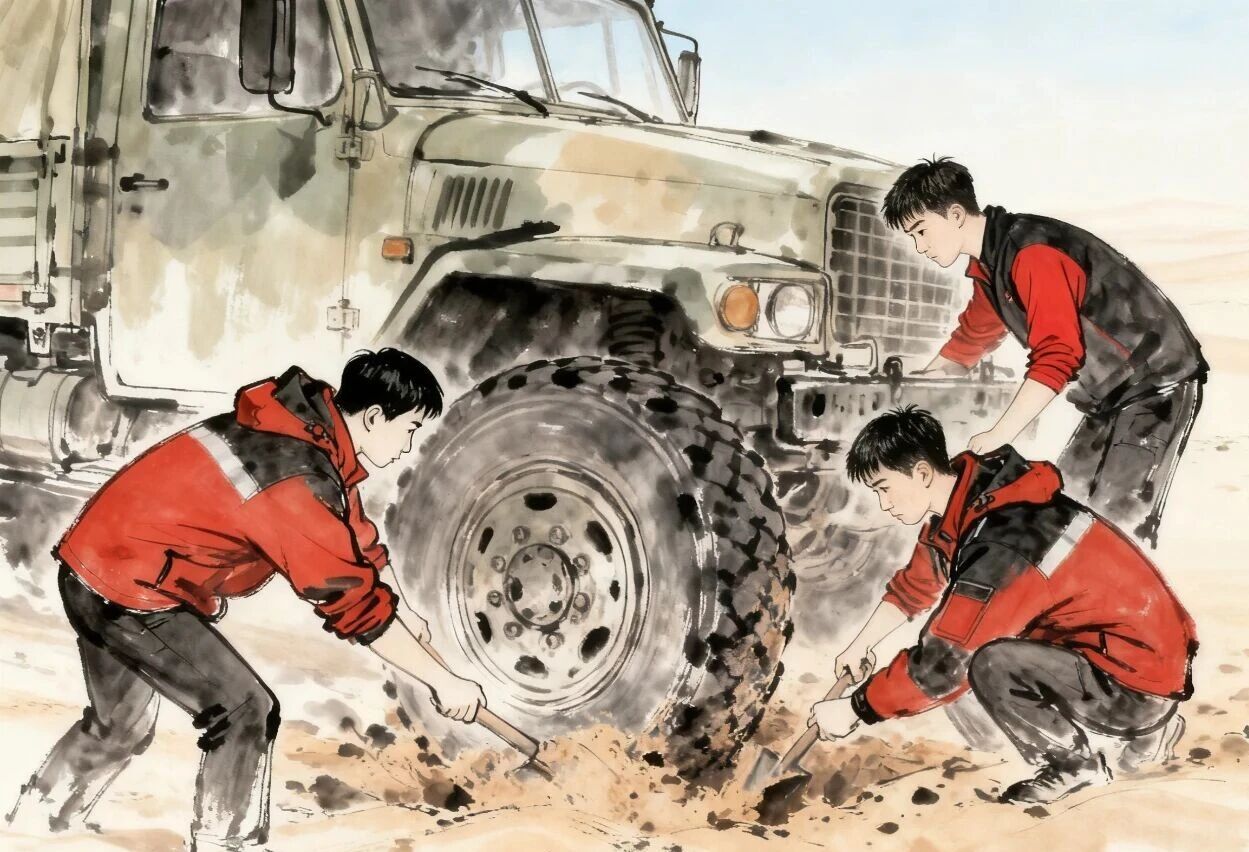 大家輪班接力,經(jīng)過數(shù)小時(shí)的奮戰(zhàn),深陷的車輪終于露出足夠的受力空間,緩緩駛出沙坑,奔赴目的地。